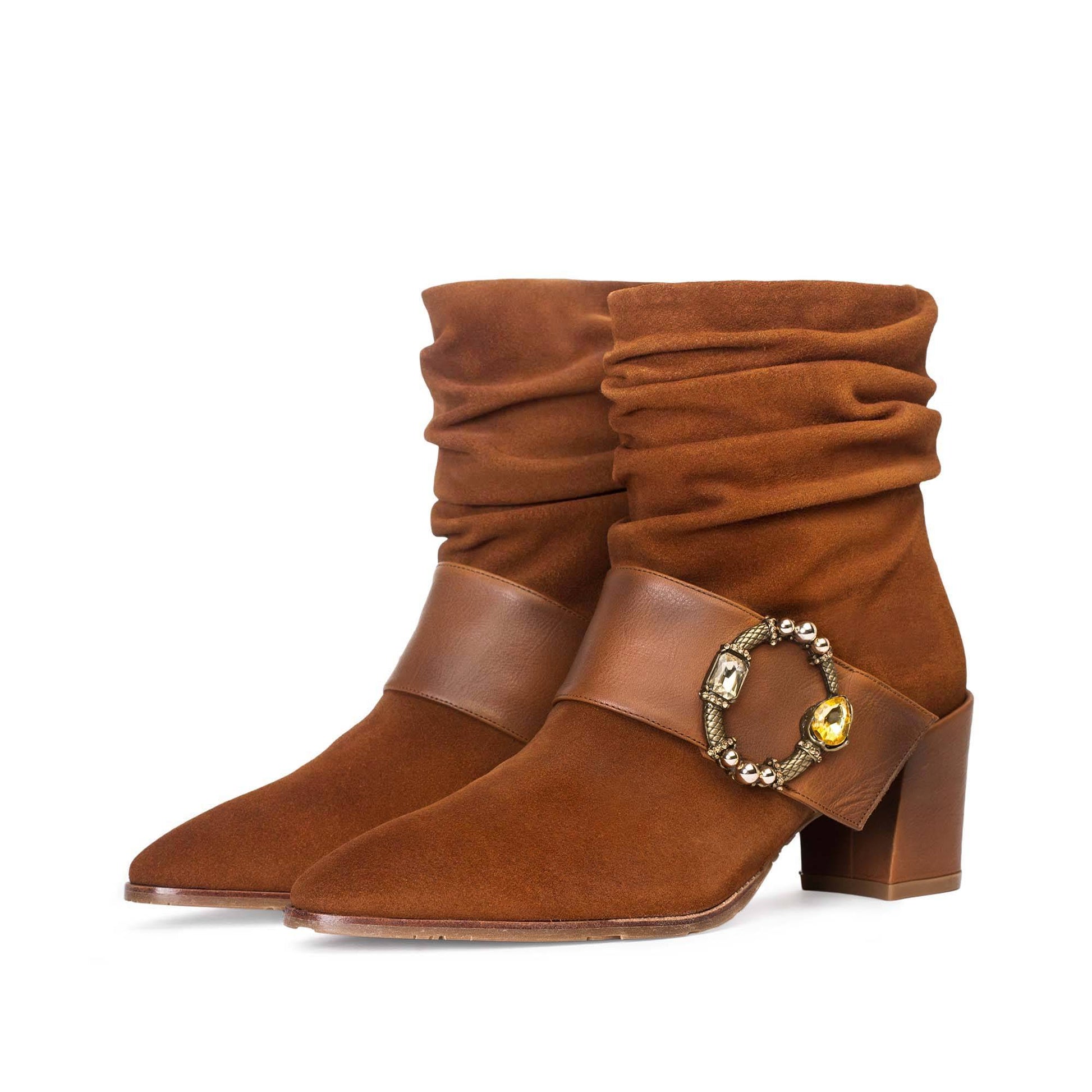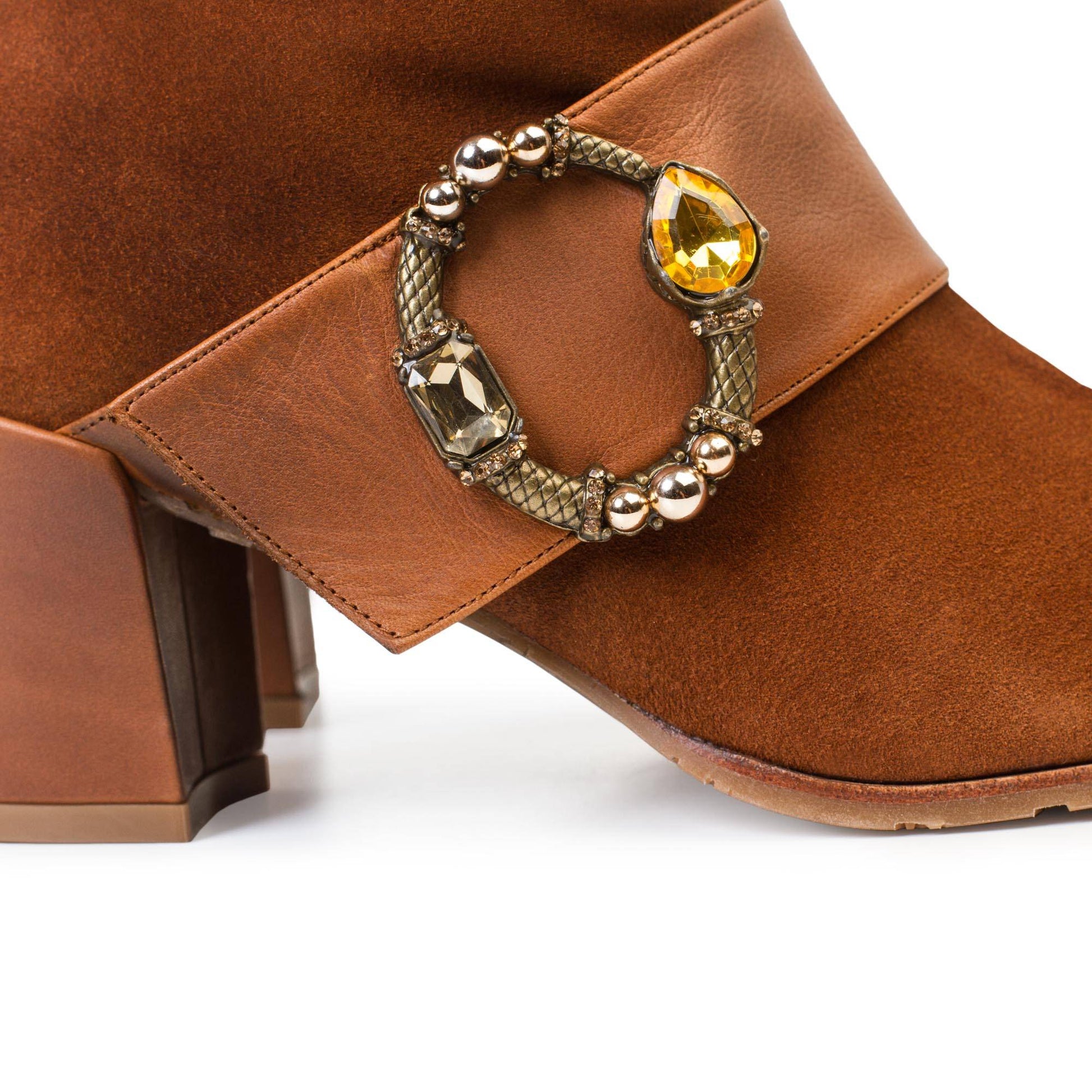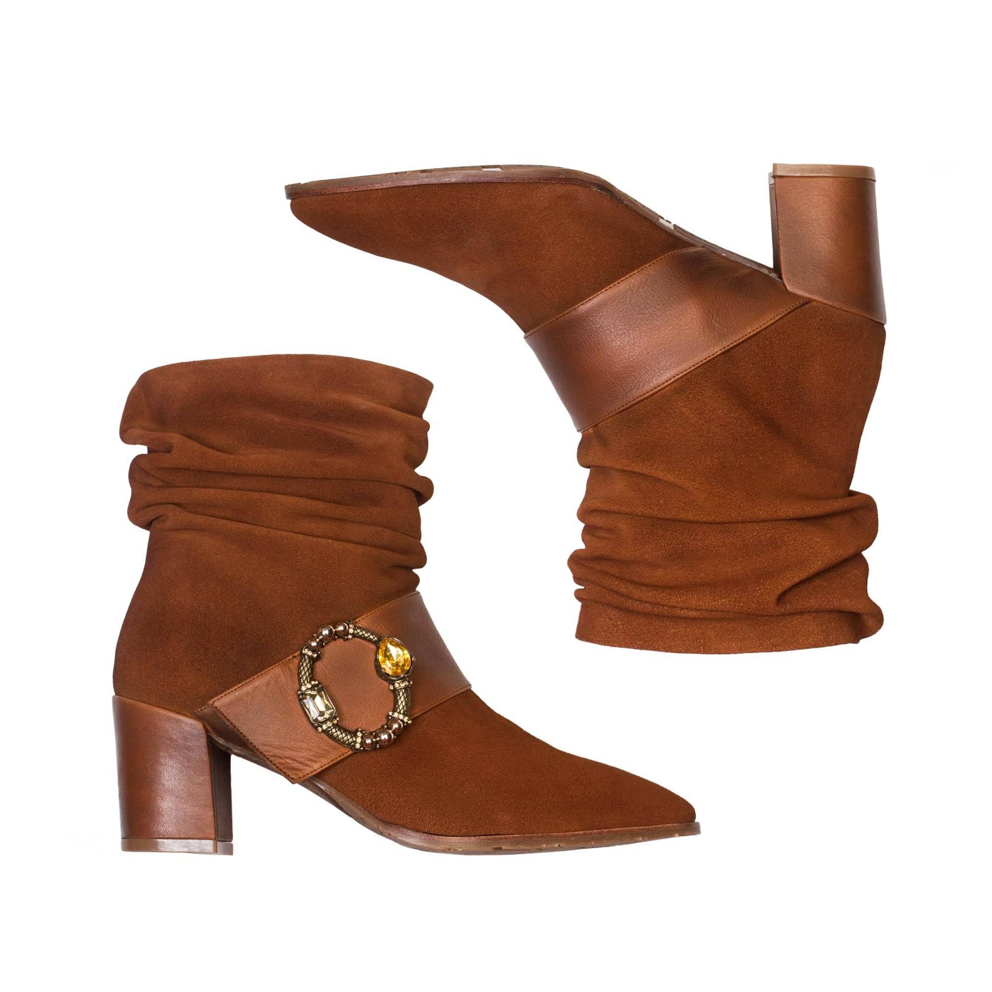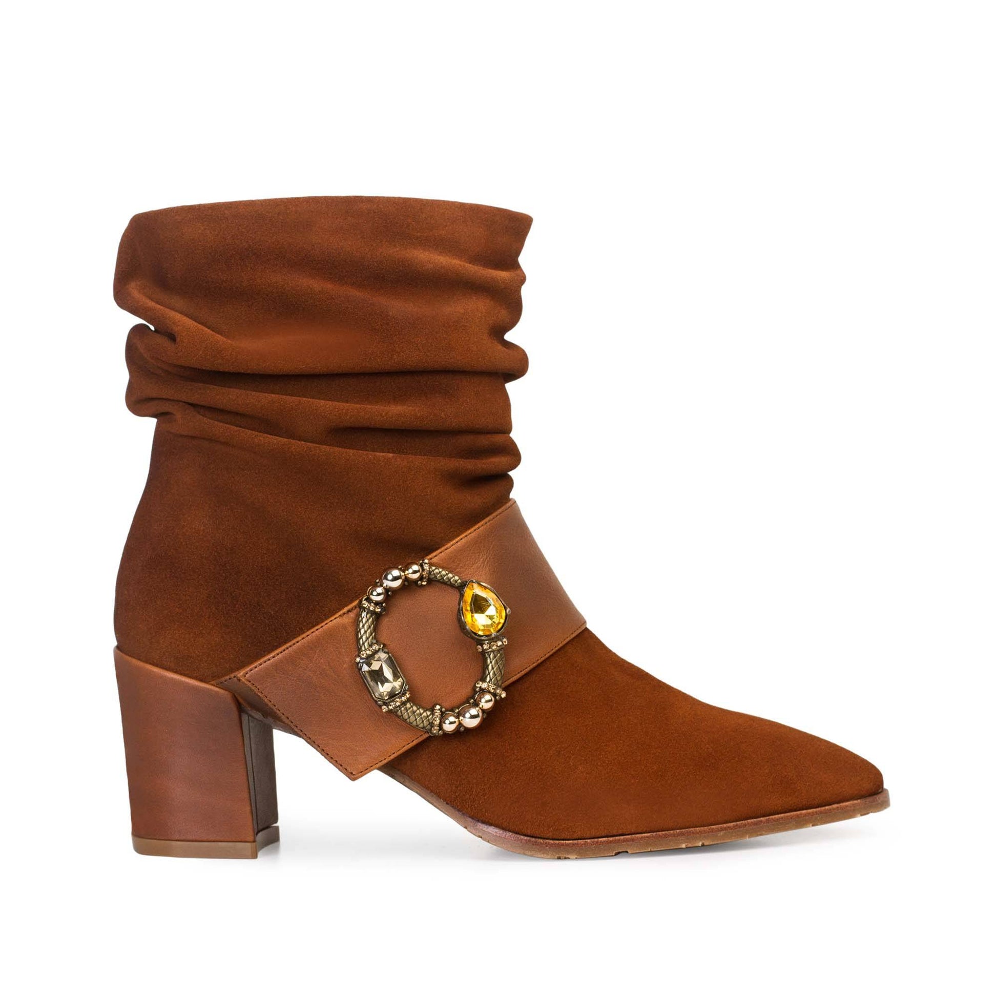 Un modelo hecho en piel de primera calidad de serraje en tono tostado combinado con napa al tono en banda y preciosa hebilla metálica con piedras en contraste. Punta semiafilada. Piso en TPU personalizado de Paco Gil y muy flexible para una pisada perfecta.