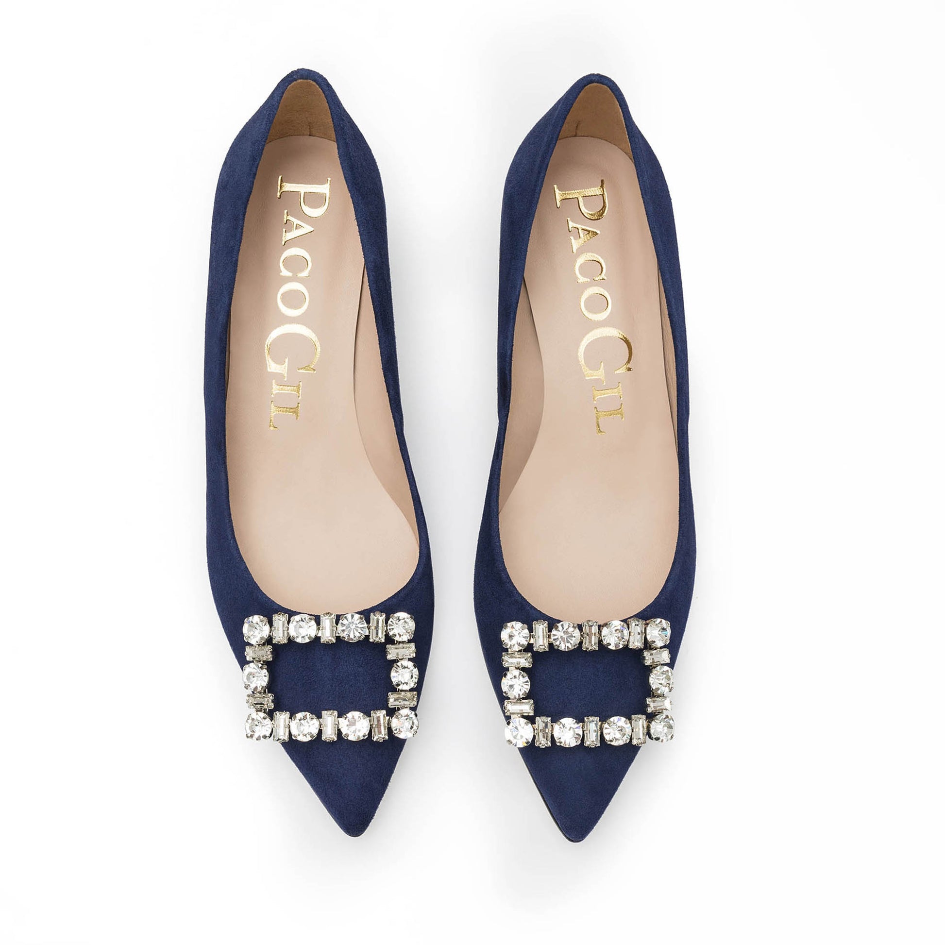 Zapatos de salón de mujer creados en suaves pieles naturales tipo ante en color azul marino y adorno de pedrería.