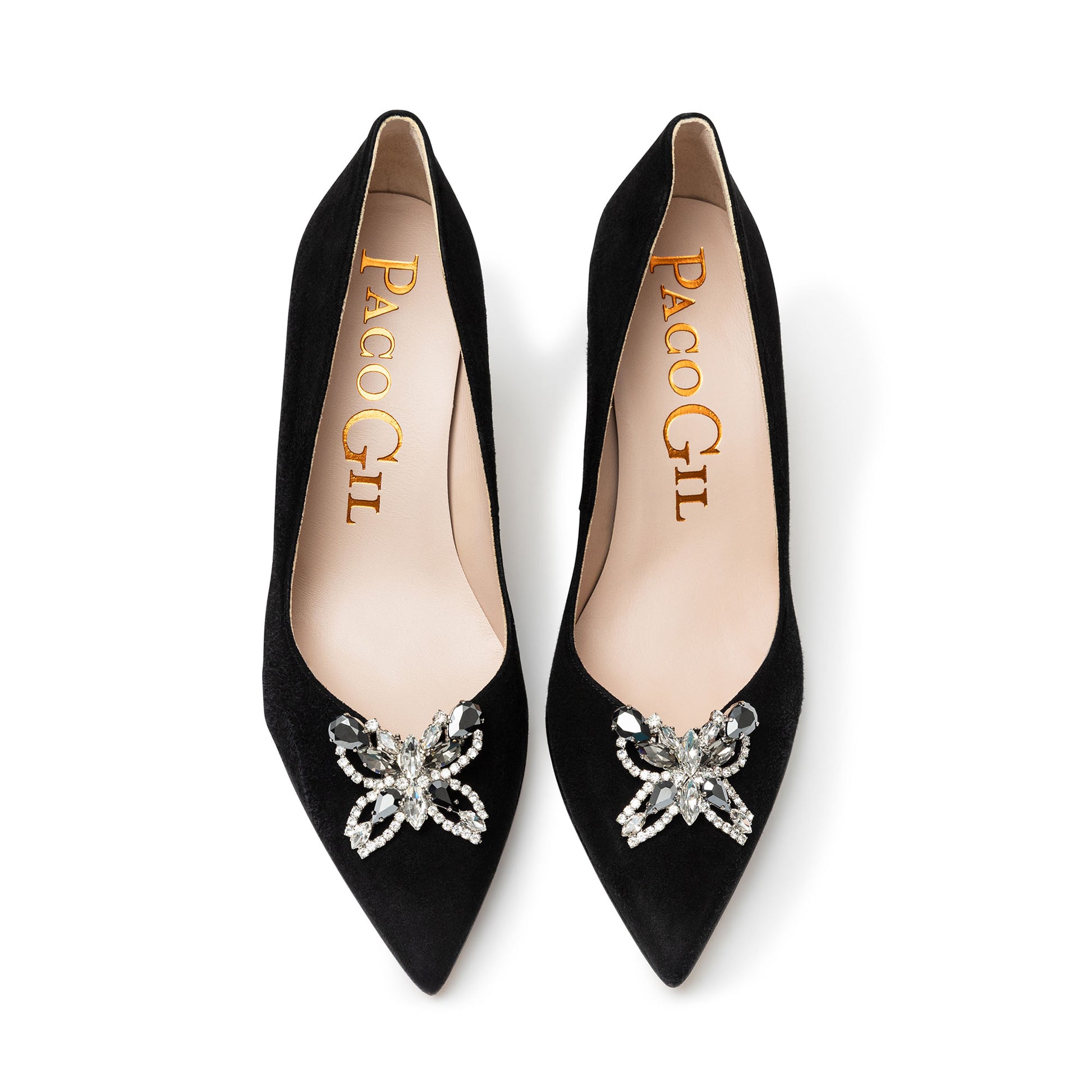 Ante negro | Tacón 7,5 cm | Adorno joya mariposa | Plantilla gel | Suela de cuero | Artesanía española