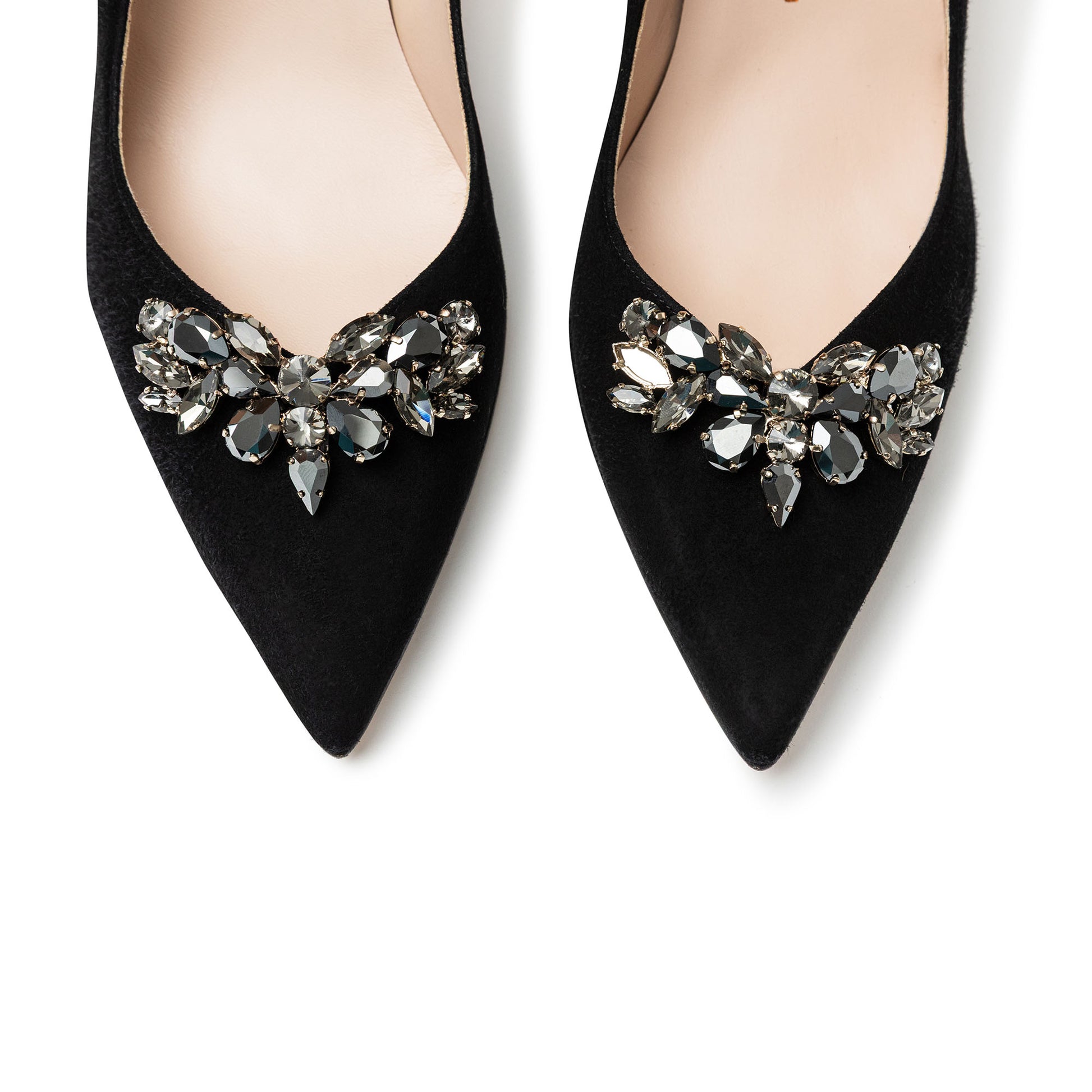 Confeccionado en suave ante negro de primera calidad, su diseño clásico se realza con un delicado adorno floral en la misma piel, que aporta personalidad y un toque escultórico lleno de estilo. Su escote en forma de corazón estiliza el pie de manera sutil, mientras que su tacón fino de 7,5 cm ofrece la altura perfecta con una pisada cómoda, femenina y muy estable.